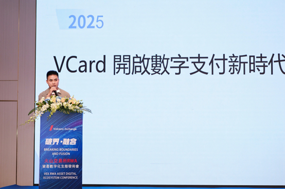 VCard商務總監狄偉以《VCard,開啟數字支付新時代》為題介紹VCard。VCard銀行卡致力於為全球用戶提供全面而高效的金融解決方案,目前擁有VCard MasterCard白金卡,VCard銀聯虛擬卡,可提供消費0手續費、線上KYC認證、充值秒到賬、綁定微信及支付寶付款等功能。